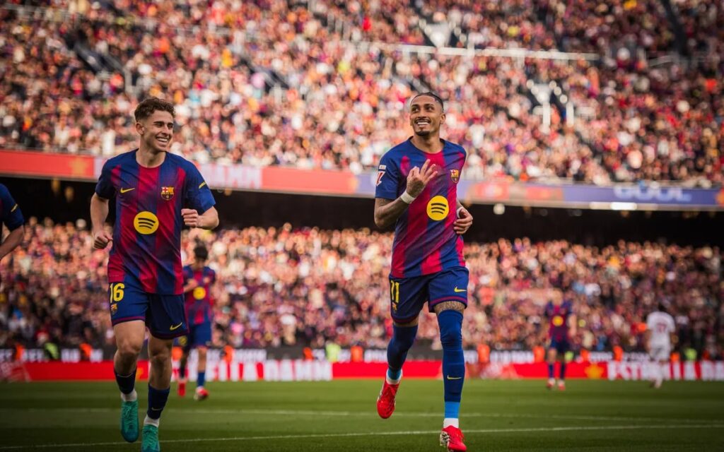 No Spotify Camp Nou, o Barcelona mostrou força ofensiva desde os primeiros minutos. Raphinha abriu o placar aos 9 minutos, em cobrança de pênalti, e ampliou aos 21, novamente da marca penal.