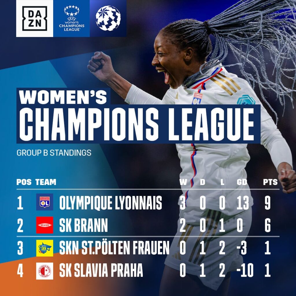 O Lyon lidera o grupo B com 9 pontos e com a vitória por 3×1 em casa contra o Brann. O maior campeão da Champions League segue com a campanha da fase de grupos invicta. Os gols foram marcados por Ada Hegerberg, a maior goleadora da Champions, Diani (2), e o único gol do Brann pela Kielland.