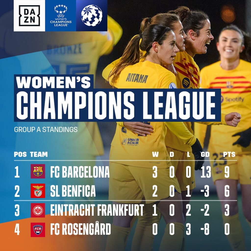 O atual campeão Barcelona venceu com tranquilidade jogando fora de casa contra o Rosengard, no placar de 6×0, liderando o grupo A com elasticidade, somando 9 pontos, com 3 vitórias em 3 jogos. Além disso, a partida contou com o 200° gol da equipe na competição. Os gols foram marcados por Jessica Samuelsson (GC), Salma Paralluelo, Aitana Bonmatí, Mariona Caldentey e Martina Fernández.